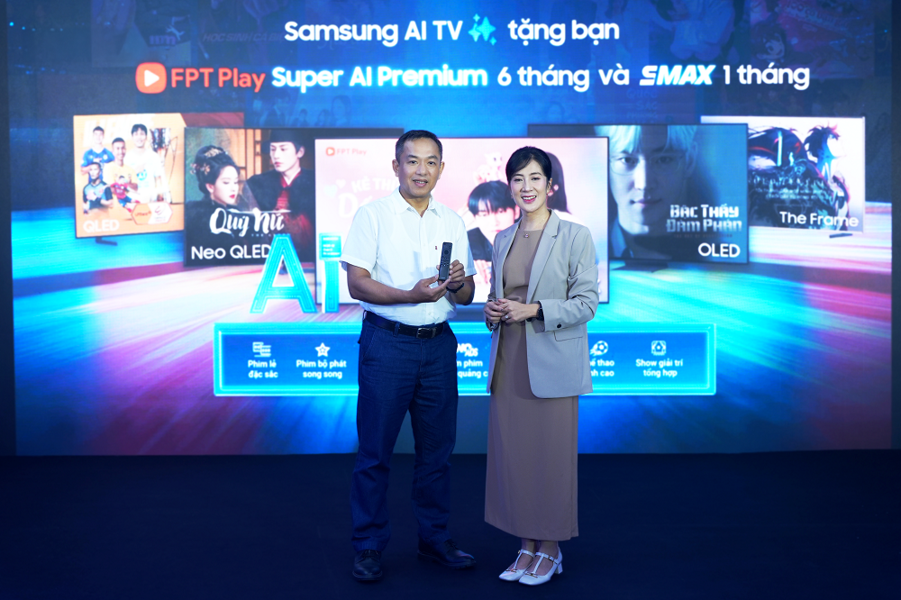 Ông Phạm Thanh Tuấn – Tổng Giám đốc FPT Play và Bà Nguyễn Huyền My – Giám đốc Điều hành Ngành hàng Điện tử Nghe Nhìn Samsung Vina tại sự kiện Họp báo ra mắt Samsung Vision AI 2025 (Ảnh: Samsung)